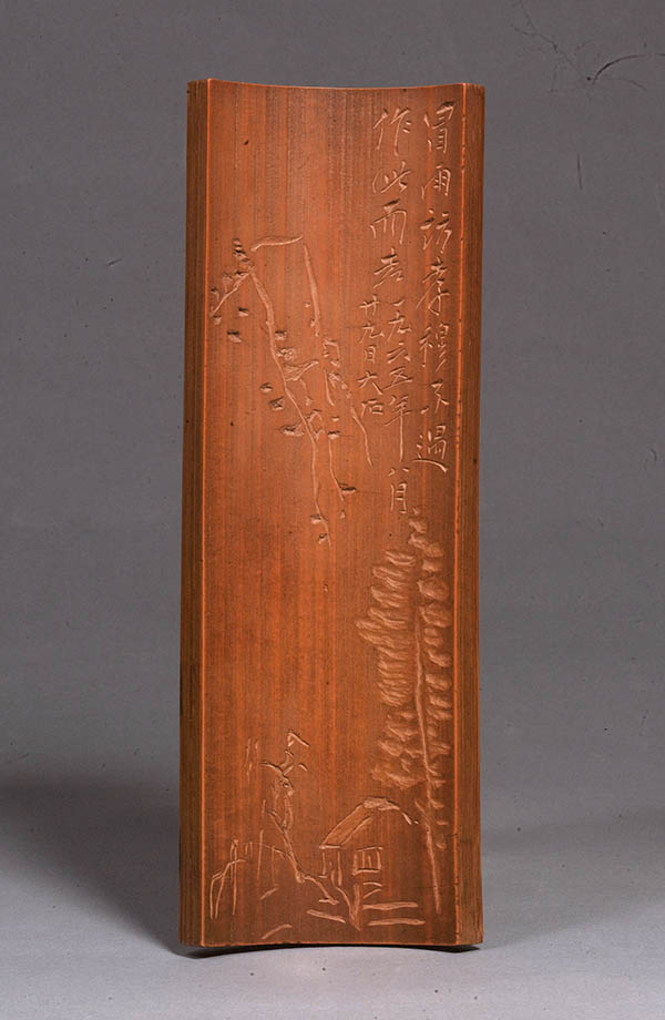 蔬果山水双面便条臂搁,徐孝穆刻唐云画“冒雨访孝穆不遇,作此而去”,22x7.5cm,1965