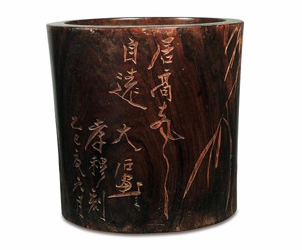 孝穆与画家赖少其公交私谊俱佳。1952年至1959年间赖少其在上海工作,通过唐云认识了孝穆。他曾先后任华东美术家协会党组书记,上海市文联副主席,上海市美术家协会副主席,后定居广州。我在孝穆家中看到过赖少其书写的“凭栏櫊”的匾额,黑底绿字,分外醒目。赖在沪时,曾得到过一个紫檀笔筒,其色如漆,似枣心木。唐云在笔筒底部写了“少其长物”四字,大有魏晋时人王恭“作人无长物”的风度。书法大师白蕉为其撇了几笔兰花,并题诗一首:“我有刀如笔,安知笔非刀。平时作尘拂,作战当梭标。”字画当然极其优秀,而经过孝穆操刀,“在原作的基础上予以升华,使其更高、更生动、更美,那是属于孝穆自己独有的美!”白蕉曾经评论道:“刻而不刻者为能品,不刻而刻者为妙品,铁笔错落而无刀痕者为神品。”孝穆的竹刻就是这样的神品。老舍先生称赞孝穆竹刻“有虚有实,亦柔亦刚”。