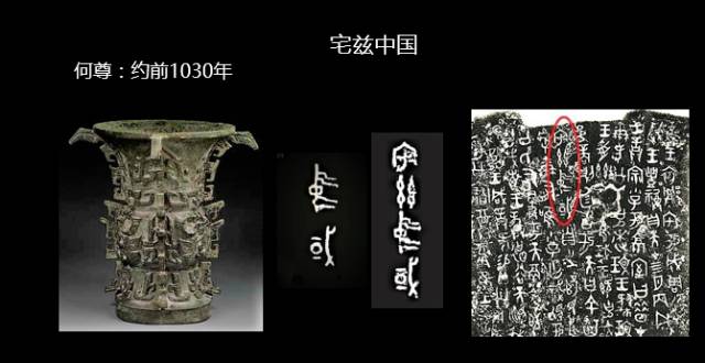 “中国”这个概念首次出现在周成王时期的青铜器“何尊”的铭文上,时间大约是公元前1030年。何尊铭文“宅兹中国”,“宅”是居住的意思,“宅兹中国”就是要住到中国去,搬迁到天下的中央地区去。大家看图片,当时“中国”两个字是这么写的。当时的“中国”就是西周时期的洛邑,也就是今天的洛阳及其周边地区。大家看一个细节,当时的“中国”的“国”字还没有围墙,不封闭,心态也是开放的。