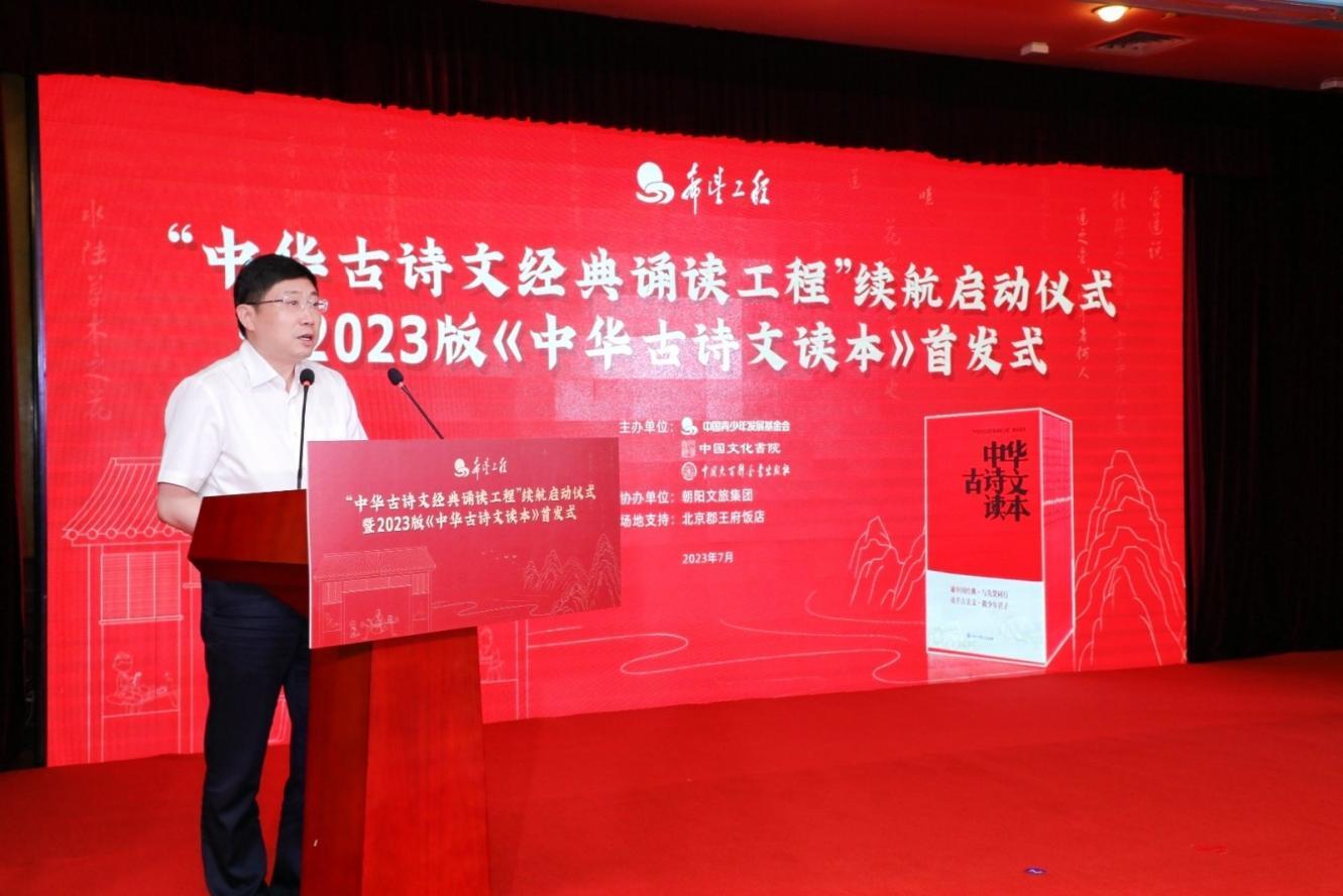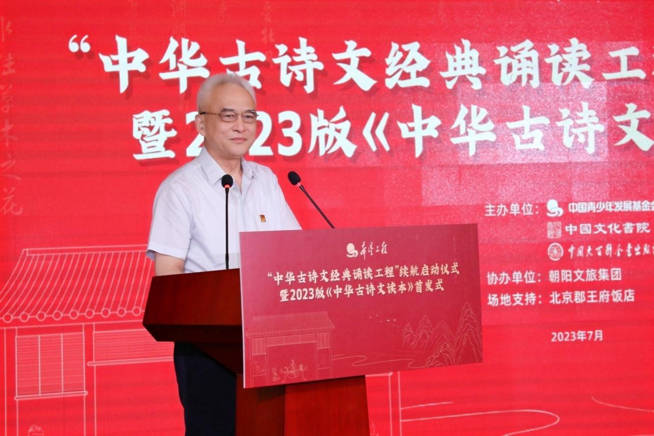 7月18日,由中国青少年发展基金会、中国文化书院、中国大百科全书出版社联合主办的“中华古诗文经典诵读工程”续航启动仪式暨2023版《中华古诗文读本》首发式在北京郡王府举行。“中华古诗文经典诵读工程”是中国青少年发展基金会在1998年发起的一项公益活动,经过25年岁月的涵养与积淀,今天与更新推出的2023版《中华古诗文读本》一道,伴随新时代青少年的茁壮成长再度扬帆启航。
