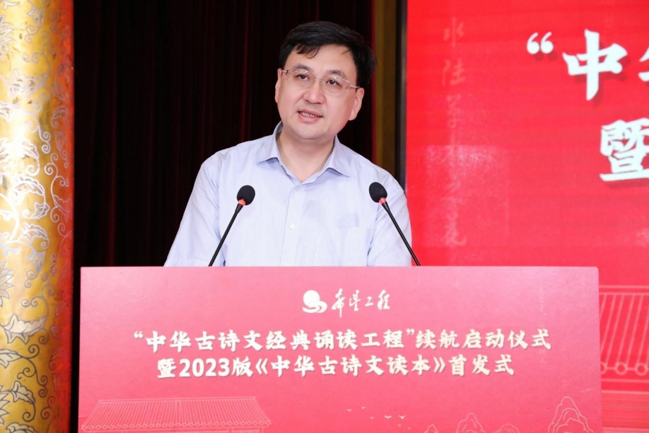 在启动仪式上,中国青少年发展基金会党委书记、理事长郭美荐深入阐释了这项活动的重要意义,勉励广大青少年深刻领会习近平总书记的重要要求和殷切期望,早日成长为有理想、敢担当、能吃苦、肯奋斗的社会主义建设者和接班人。中国文化书院院长陈越光重申了参与发起“中华古诗文经典诵读工程”的初衷,寄语新时代青少年在诵读经典的过程中学会做人的道理,将青春的理想汇入民族文化发展和人类历史进步的浩瀚大海。中国出版集团副总经理、党组成员陈永刚介绍了2023版《中华古诗文读本》的突出特点,并表示集团与百科社将以此为契机,继续在传承与弘扬优秀传统文化工作中,积极参与“诵读工程”,为提高中小学生文化素养贡献出版力量。