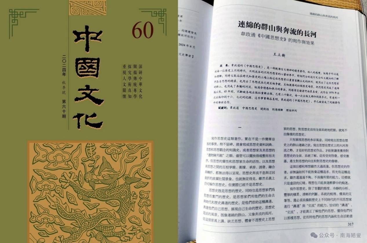 【编者按】韦政通,江苏镇江人,当代著名哲学家、思想家。从大陆到台湾,从差点饿死到名满天下,从当记者、写小说到开启思想的探险、宣扬“异端的勇气”,他的一生充满传奇色彩,自认扮演过三种角色:学者、思想家、知识分子。他出版过数十种哲学、思想、文化类学术专著,其中近百万字的《中国思想史》被赞誉为“中国哲学史的里程碑”,被众多大学用为哲学系和文科生的教材。那么,这部著作究竟有何值得留意之处?如何读懂中国历史上那些不朽灵魂的精神世界?当代知识人如何在历史的幽深隧道中汲取能量、找到前行的方向呢?《中国文化》2024年秋季号,刊载了深圳大学人文学院王立新教授撰写的《连绵的群山与奔流的长河——韦政通《中国思想史》的写作与效果》,全文近3万字,出入前贤世界,不止抉奥阐幽,更有风义传薪之旨。经作者授权,凤凰网国学将分章陆续转载,各期标题为编者增拟。本篇为该文第三节,配图由作者提供。