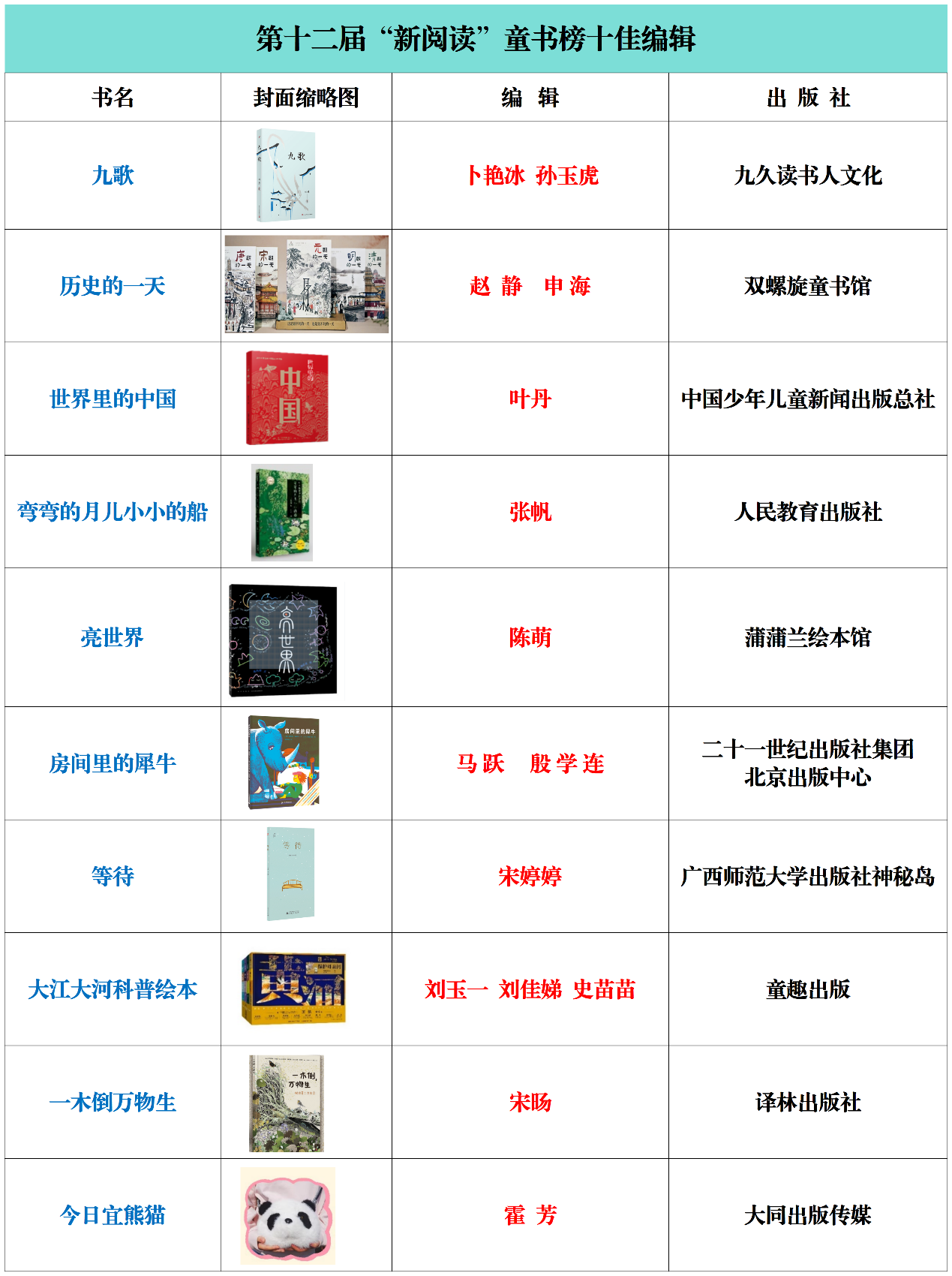 获得“十佳童书奖”的有:九久读书人《九歌》、双螺旋童书馆《历史的一天》、中国少年儿童新闻出版总社《世界里的中国》等10部作品。其中8本为原创,2本引进;2本适合幼儿阶段,6本适合小学阶段,2本适合中学阶段;2本科普书,5本图画书,3本儿童文学。
